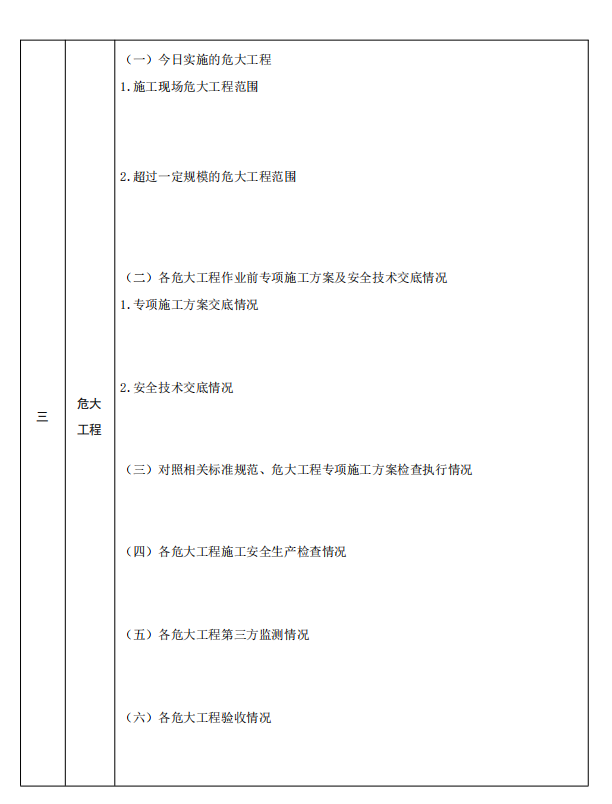 对项目当日实施作业的危大工程,应当逐项填写施工单位进行施工安全生产检查情况。项目专职安全生产管理人员检查发现危及人身安全的紧急情况的,应当注明是否已立即组织作业人员撤离危险区域,并如实记录紧急情况处置责任人、处置措施、处置结果等。当日处置工作未完成的,应当注明“处置工作未完成”。