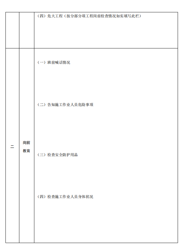 应当填写检查时间、检查区域、存在问题、整改落实责任人、整改完成时间、计划复查时间等,要做到先防护后施工。安全防护检查内容应至少包括:个人劳保防护用品,高处作业及临边洞口安全防护措施,电气具安全防护装置等。对于岗前排查出的安全防护问题,必须在当日班前晨会予以整改落实,整改完成后方可进行施工作业。