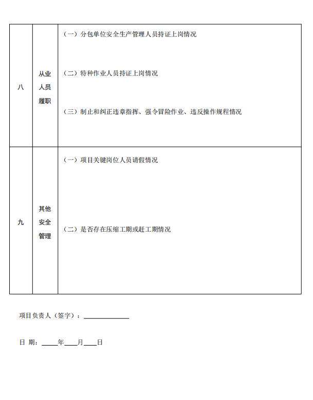 (一)建立健全项目全员安全生产责任制,明确各岗位的责任人员、责任范围等内容,加强对项目全员安全生产责任制落实情况的监督、考核;